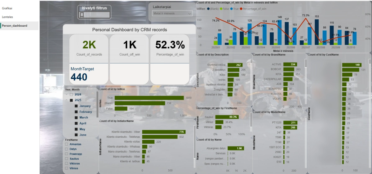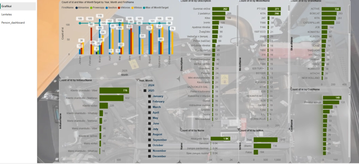Detalizuota Analizė: Ataskaitos (žr. Power bi detalizuota CRM analizė ir Power bi detalizuota CRM lentelės) leidžia matyti pardavimų ir darbų apimtį pagal mėnesį, darbuotoją (InitiatorName), aprašymą, modelį (ModelName) ir prekės ženklą (BrandName).
